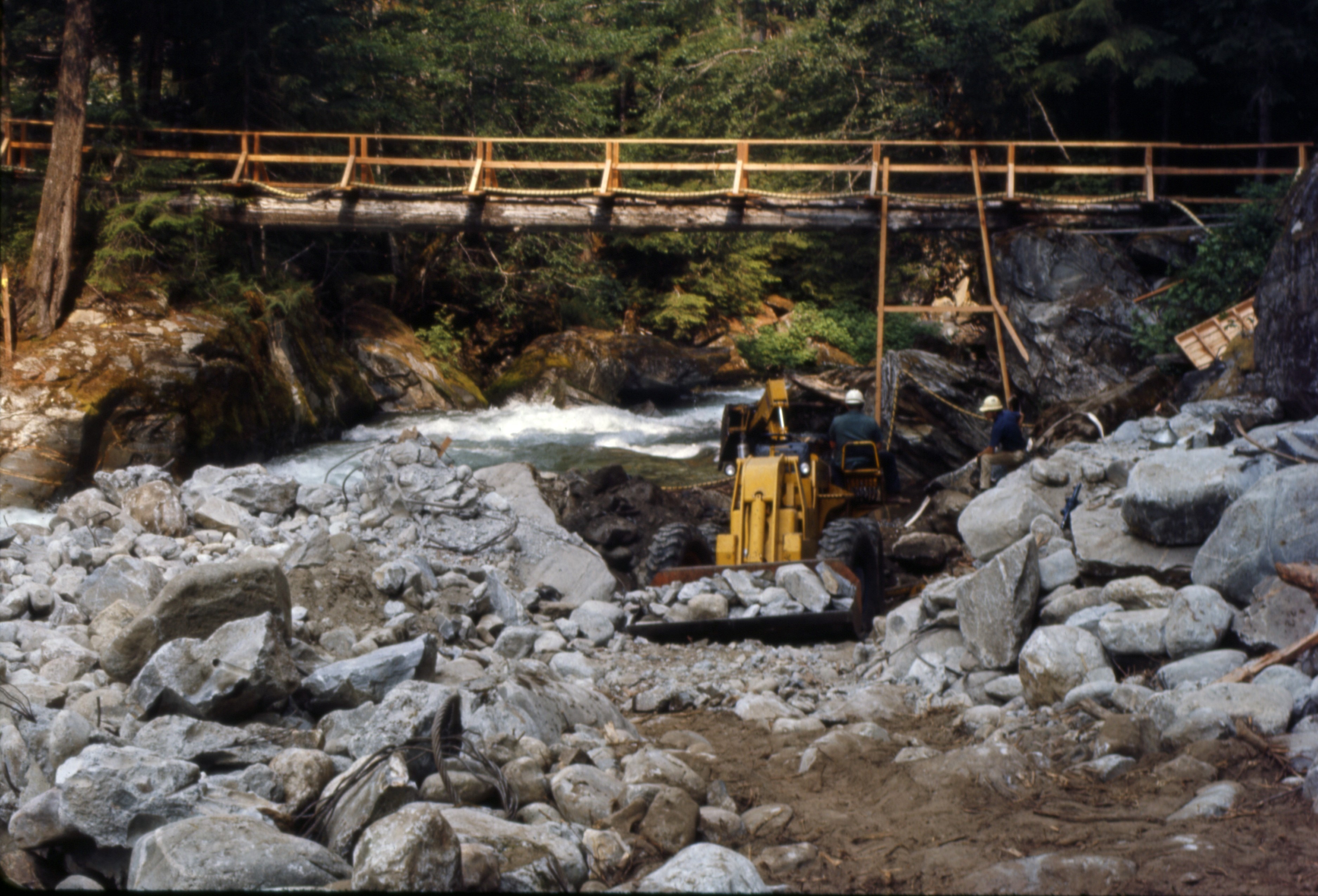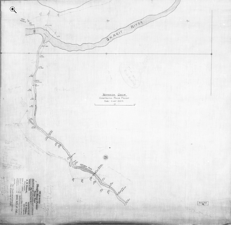In the summer of 1918, the City Engineer’s Office sends a hydrographer and assistant to the Skagit to determine the location of a temporary generating powerhouse for the construction camp and lumber mill. Newhalem Creek was ultimately selected.