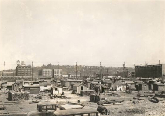 Families doubled up in apartments, others were evicted and built makeshift houses. Groups of these dwellings for the homeless were called Hoovervilles. In Seattle, one of the largest cluster of homeless was located on the tide flats on the site of the former Skinner and Eddy Shipyard. Its boundaries were the Port of Seattle, warehouses, and Railroad Avenue. A city of shacks, dwellings were fashioned from packing boxes and any other discarded materials the residents could find. Hundreds of men lived there. Other large cluster of shacks in Seattle were located in the southern industrial section and in Interbay.