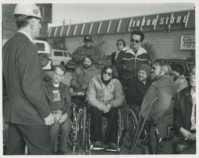 Pictured standing with two canes is Paul Wysocki, Director of the city's Handicapped Services Unit and later supervisor of the Human Rights Department's Affirmative Action/Disability Unit.