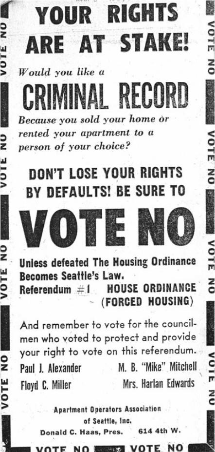 One avenue taken in fighting housing discrimination was the attempt to change the law to make it illegal to discriminate when selling or renting. In December 1961, the Seattle City Council held a public hearing in response to a request from the Seattle branch of the NAACP for passage of an ordinance prohibiting discrimination in housing. Many groups spoke in favor of the ordinance; representatives of the Seattle Real Estate Board and the Seattle Apartment Operators' Association spoke against legislation.