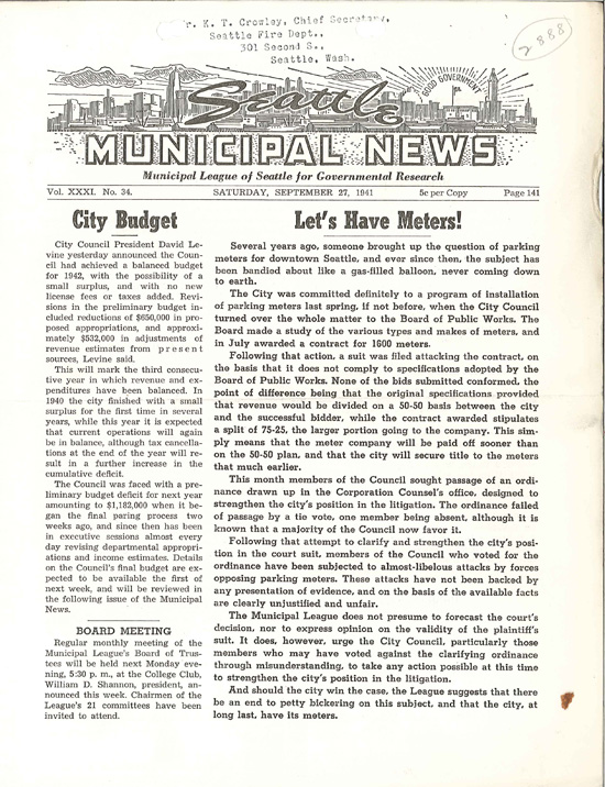 SMA's holdings include a set of issues of Seattle Municipal News, the newsletter of the Municipal League. The September 27, 1941, edition has a front-page story entitled, "Let's Have Meters!" At the time, Seattle was in the midst of legislative and legal turmoil over installing parking meters on downtown streets. The article claimed that from the time the issue was first broached, "the subject has been bandied about like a gas-filled balloon, never coming down to earth."