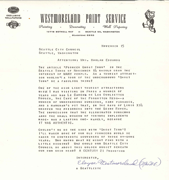 The Council did not feel there was a role for the city in the preservation of the "ghost town," but forwarded the letter to the Central Association of Seattle, a downtown development organization, for the group's consideration. Just a few years later, the very same Central Association was behind the proposal to raze much of Pioneer Square for the construction of a new arterial road.