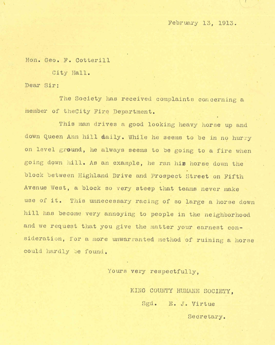 In 1913, Elizabeth J. Virtue of the King County Humane Society wrote to the mayor with a complaint about a member of the Fire Department. The letter stated, "This man drives a good looking heavy horse up and down Queen Ann [sic] hill daily. While he seems to be in no hurry on level ground, he always seems to be going to a fire when going down hill." She condemned this "unnecessary racing of so large a horse down hill" and claimed that "a more unwarranted method of ruining a horse could hardly be found."