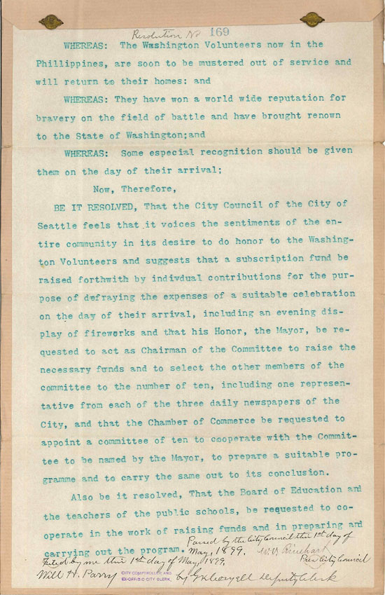 One of Seattle's earliest celebrations of its veterans came in 1899 upon the return of the First Washington Volunteer Regiment from the Spanish-American War. The 1200 volunteers fought around Manila for six months, with 129 killed and wounded. According to a City Council resolution, the soldiers "won a world wide reputation for bravery on the field of battle and have brought renown to the State of Washington."