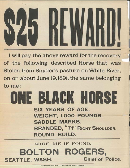 The same police chief had previously written to the Council requesting reimbursement for money spent recovering a stolen police horse. The horse went missing from a pasture in south King County, and Chief Rogers "sent two men up White River on horseback to look him up." After the search went as far as Tacoma, Rogers presumed the horse was not lost but stolen. He printed up flyers offering a $25 reward for its recovery, which resulted in the horse being located in North Bend and returned. Concerned about being reimbursed - he apparently did not get prior authorization to offer the reward - Rogers explained, "I took upon myself to offer the Reward as time is a very important factor in a matter of that kind," and further noted that $45 was a good investment to gain the return of a $150 horse.