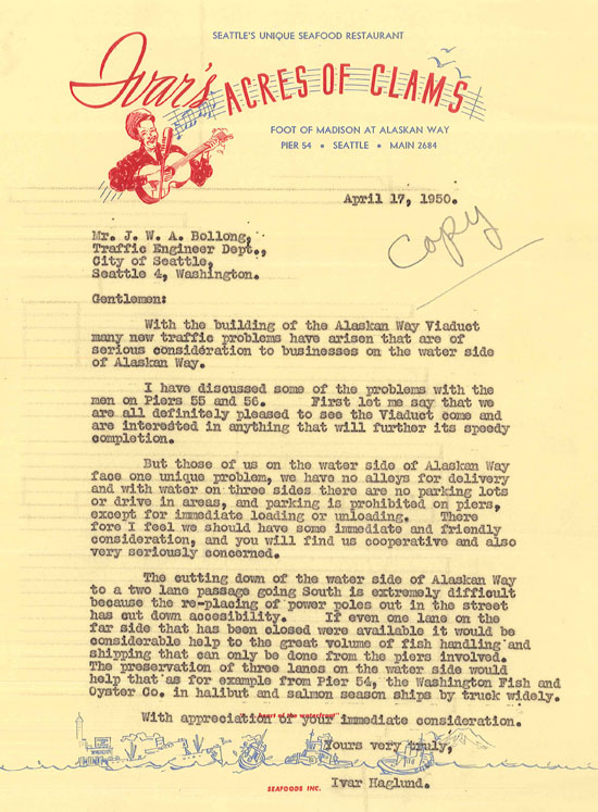 Seattle's citizenry was generally enthusiastic about building the new Alaskan Way Viaduct. However, its construction disrupted normal life in the work zone. In 1950, Ivar Haglund wrote to the city's traffic engineer complaining that construction-related lane closures on Alaskan Way were limiting access to businesses on the water side of the street, leaving them no alleys for delivery and no parking areas. He asked that at least one additional lane be opened, as it would "be considerable help to the great volume of fish handling and shipping."