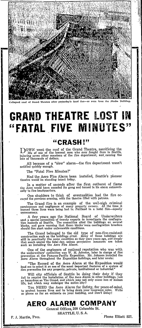 Proving that anything can and will be used for advertising purposes, the Aero Alarm Company ran a large ad in the Seattle Times the very next day, claiming that had their alarm been installed, "Seattle's pioneer theatre would be standing intact today."