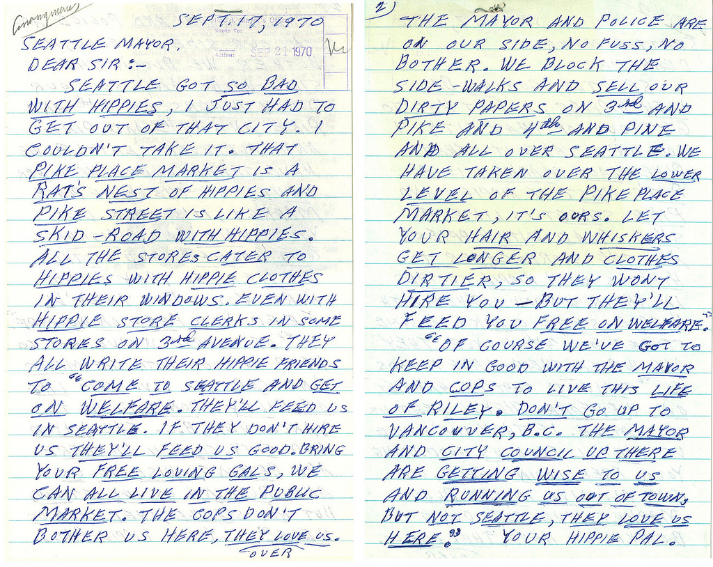In September 1970, Mayor Wes Uhlman received the following letter from an anonymous writer. The original was written in all caps with copious underlining.