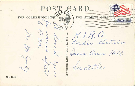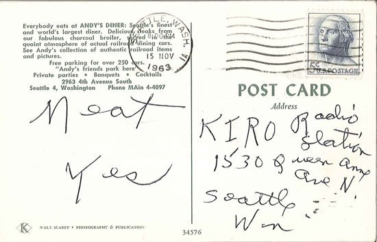 A cache of postcards addressed to "MEAT, KIRO Radio" shows that KIRO had also been involved in the issue, soliciting opinions from the city's meat consumers. Messages on the postcards ranged from "Meat Yes" to "I have long resented the ruling that interrupts the sale of needed meats - hours have nothing to do with our needs." to "I definitely would like to see the 'cutlet curfew' abolished."