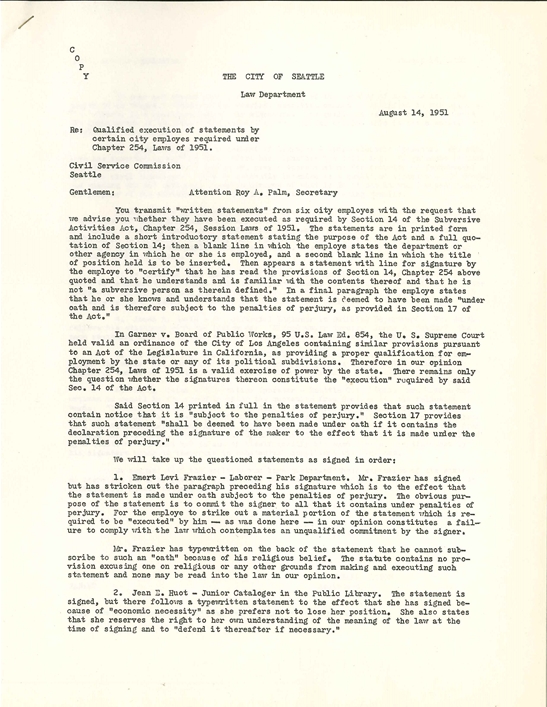 During the 1950s Red Scare, Seattle city employees were required to sign oaths attesting that they were not "a subversive person," (i.e., a communist). A 1951 memo found in the Civil Service Commission Subject Files addressed the particulars of six employees who had not strictly followed instructions on the loyalty oath.