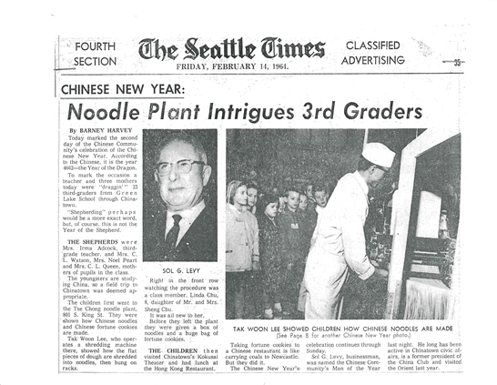 The February 14, 1964, edition of the Seattle Times described a school field trip under the headline "Chinese New Year: Noodle Plant Intrigues 3rd Graders." The story ran as follows:
