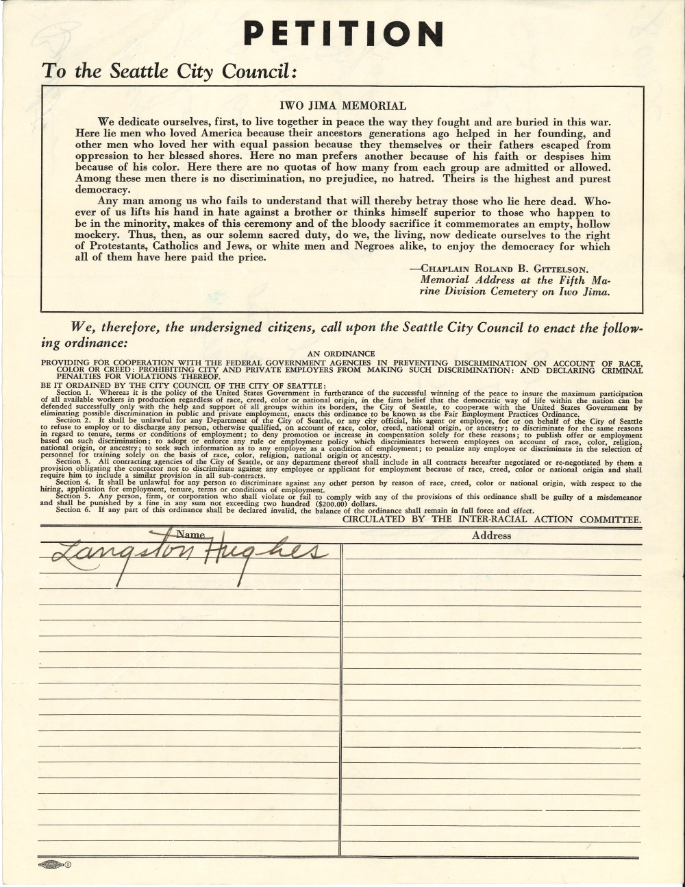 The citizens' group tried again in January of 1946, this time submitting a proposed ordinance focused mainly on City employment and contracting, alongside a petition with almost 100 pages of signatures. The cover letter calls out some of the prominent signatories, including state legislators, labor and religious leaders, the King County Sheriff and King County Prosecuting Attorney, and writer Langston Hughes. The letter encouraged adoption of the ordinance to "give renewed hope and faith to our citizens that democracy is vitally alive in the city of Seattle."
