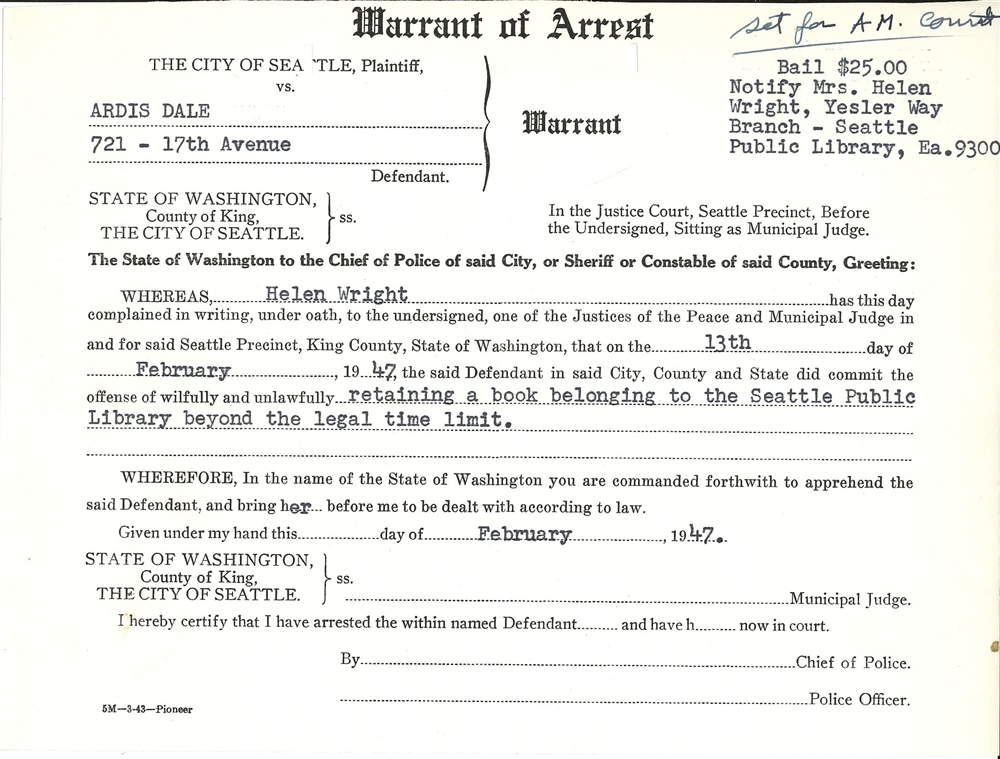 I have received a criminal complaint from the Seattle Public Library asking for your arrest for failure to return certain books belonging to said Library. I am loath to issue this complaint immediately, knowing that there are often extenuating circumstances in many cases. You are, therefore, notified to return said book or books to said Seattle Public Library by March 15, 1945, or make financial restitution to said Library therefor, or I shall be compelled to issue said warrant for your arrest thereon. I trust you will not make it necessary for me to do so.
