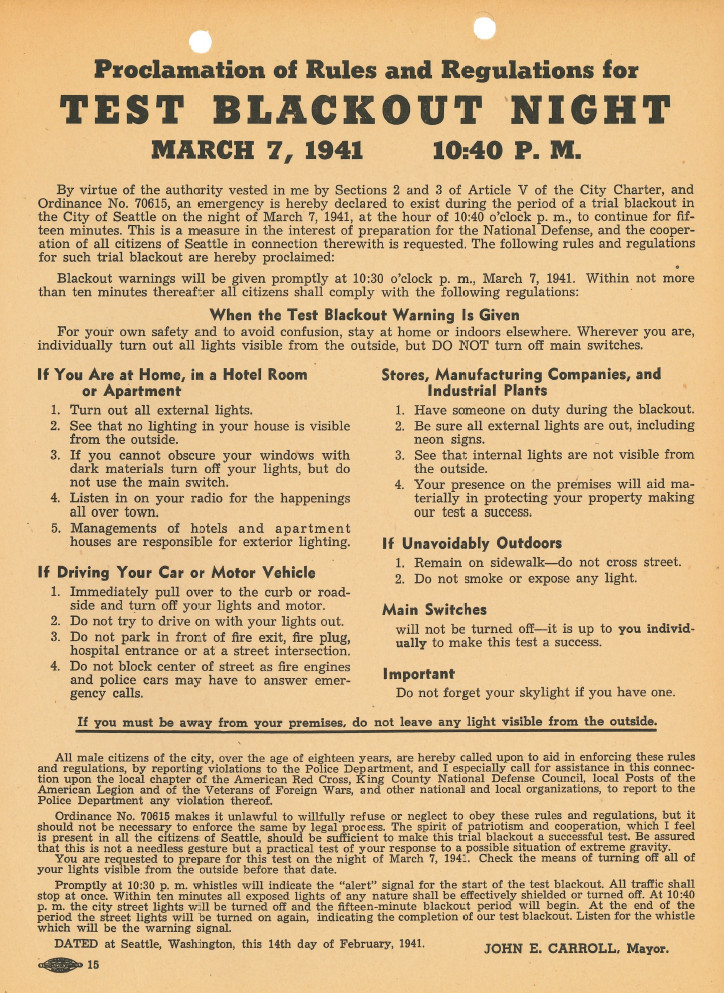 Seattle held a test blackout night on March 7, 1941, nine months before the United States entered World War II. The test was authorized by Ordinance 76015, which made it unlawful to refuse to take part. All male Seattleites over the age of eighteen were enlisted to help enforce the blackout by reporting any violations, and about 3000 Legionnaires patrolled the streets along with the police during the event.