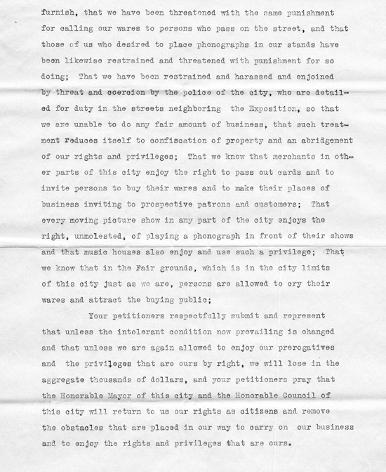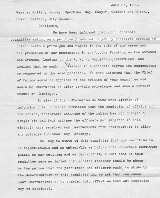 A petition was submitted in June 1909 from "owners and lessees of booths, amusement places and refreshment stands on the through fares and streets near and leading to the AYP Exposition" complaining of harassment by the police force "from a source unknown to us." The merchants wanted their right to pass out cards, play a phonograph, and "cry their wares and attract the buying public" just as the vendors inside the Exposition were able to do. The Council took no action on that petition. A second petition was filed a few days later from vendors who also complained that the police would not allow them to sell their wares on the streets and avenues leading to the Exposition. City Council denied their petition for greater leniency.