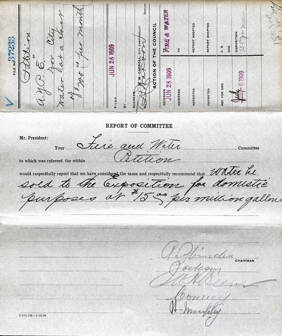 The Lighting and Water Department met with the AYPE Committee regarding pipe, hydrants, and other water equipment needed for use on the Exposition grounds, reporting that the AYPE did not want to buy the pipe outright "but wish to arrange for having it loaned to them by the City." The AYPE's Division of Works agreed that of the 21,000 linear feet of cast iron pipe, 62 hydrants, and seven or eight stand pipes, whatever was not paid for at its cost value would "be removed by the exposition management and delivered in good order to the City of Seattle."