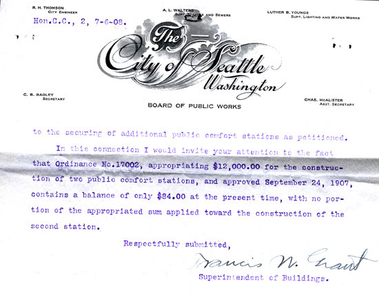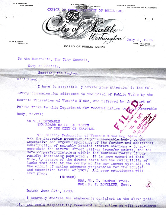 The Seattle Federation of Women's Clubs stressed the "imperative and urgent importance" of additional comfort stations (restrooms). The petition was endorsed by the Board of Public Works.