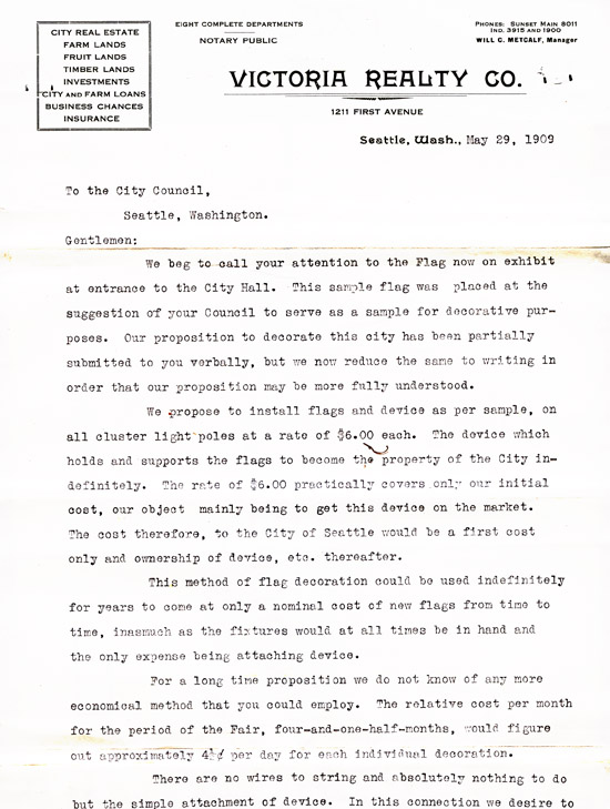 The Victoria Realty Company proposed installation of about 300 American flags on First, Second, and Third Avenues, so that the city "appear in gala attire." City Council rejected the proposal.
