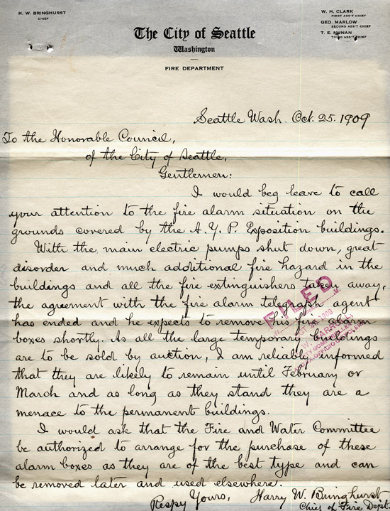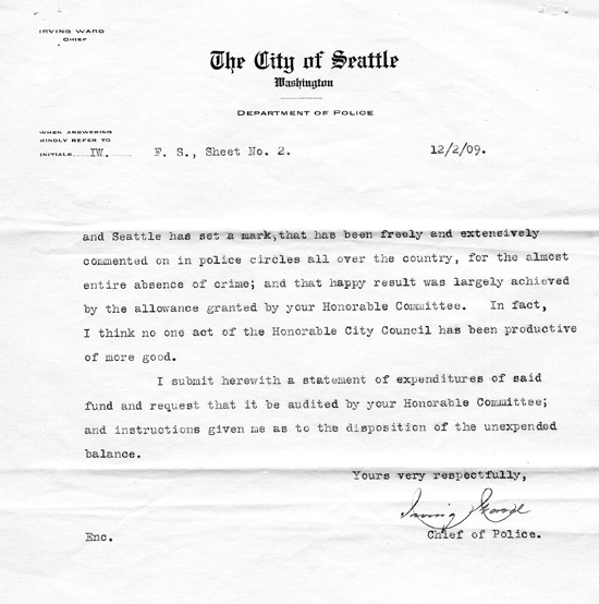 He wrote again on December 2, 1909, to thank the chairman of the Finance Committee for approving his request for additional detectives during the Exposition. He stated that the city was thus kept "free from crooks during the duration of the Fair; and Seattle has set a mark, that has been freely and extensively commented on in police circles all over the country, for the almost entire absence of crime." He provided a statement of expenditures which listed payments to the detectives, their names, and from where they were detailed. Several were from Pinkerton's, while others were from Denver, San Francisco, Kansas City, and St. Paul.
