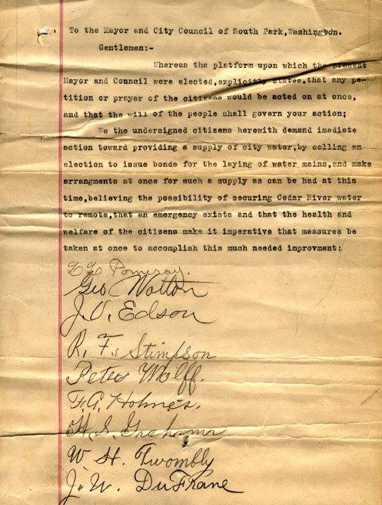 The lack of a safe water supply was the biggest issue facing the town. The town council explored the possibility of getting its water from Georgetown (which had mains that ran through South Park) or from nearby farms, but none of these plans turned out to be viable. An independent water company's supply ended up being contaminated by sewage. The continuing water woes, along with difficulty in securing electrical service, were large factors in the decision to petition for annexation. As the town continued to grow, it was clear these problems would only become more acute.