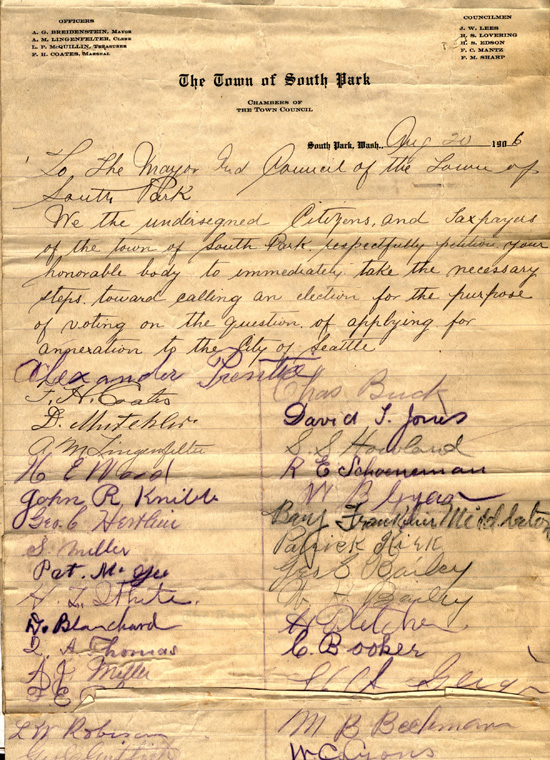 South Park citizens voted 131 to 59 for annexation to Seattle on March 23, 1907. On May 3 of that year, South Park's 0.87 square miles and 1500 residents became part of the City of Seattle.