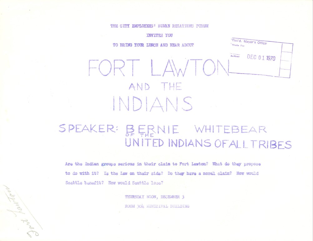 While city and national leaders were moving ahead with plans to turn Fort Lawton into a park, members of Seattle's Native American community saw the decommissioning of Fort Lawton as an opportunity to reclaim the land for use by Indigenous peoples.