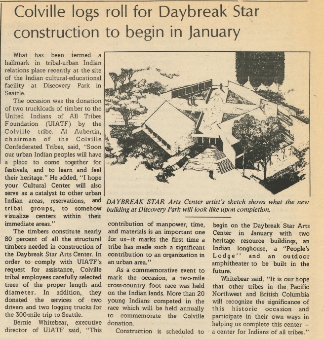 In March of 1973, the city appropriated $500,000 from the General Fund to support the design and construction of an Indian Cultural Center at Discovery Park. Additional support to the UIATF came from a $250,000 grant from the federal Economic Development Administration, as well as donations of both money and materials from various tribes, businesses, and other organizations.