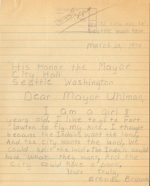 Mayor Uhlman replied to letters in favor of the UIATF claim by reiterating his strong support for developing the site as a park. "I believe that to divide the Fort Lawton land, or to give all of it to Indian groups would seriously restrict its public recreational development," he wrote. "However, I believe equity requires that all other interested groups - Indians included - should share in the planning of the recreational uses of the area. There is room, therefore, for Indian-oriented facilities and activities. But whatever the ultimate response, the response should come as a result of a planning process, not as a precondition to it."