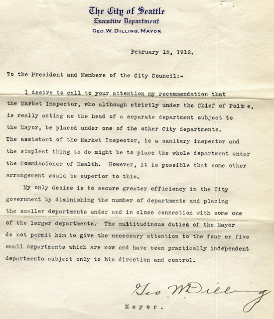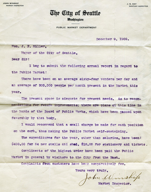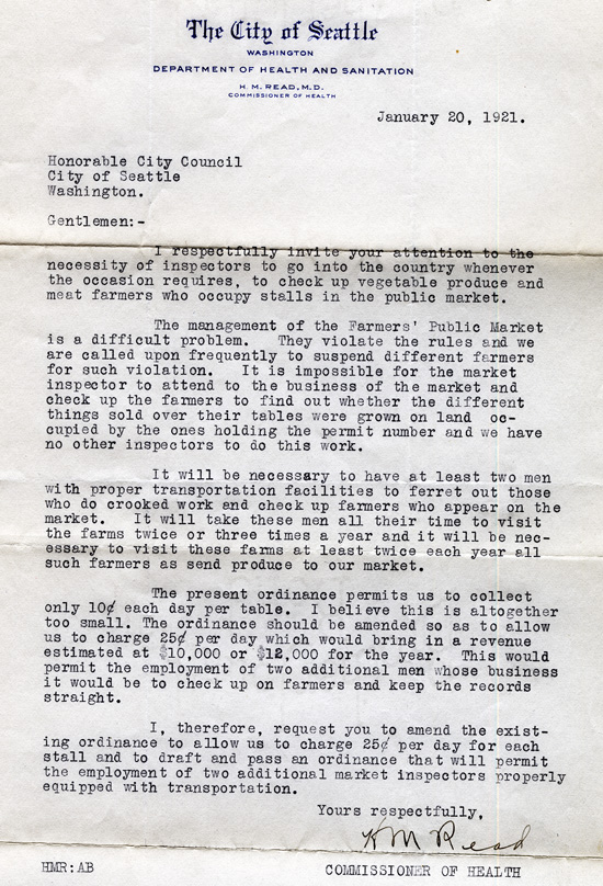 The City was involved from the beginning in regulating the market. In 1907, the Department of Public Markets and the position of Market Inspector were established, reporting to the Chief of Police. The title of Market Inspector was changed to Market Master in 1912, and the position was transferred to the Health Department. John Winship served as the first Market Inspector/Market Master from 1907 to 1923 and was responsible for issuing permits, assigning tables, collecting rents, receiving complaints and enforcing market rules, including the inspection of farms.