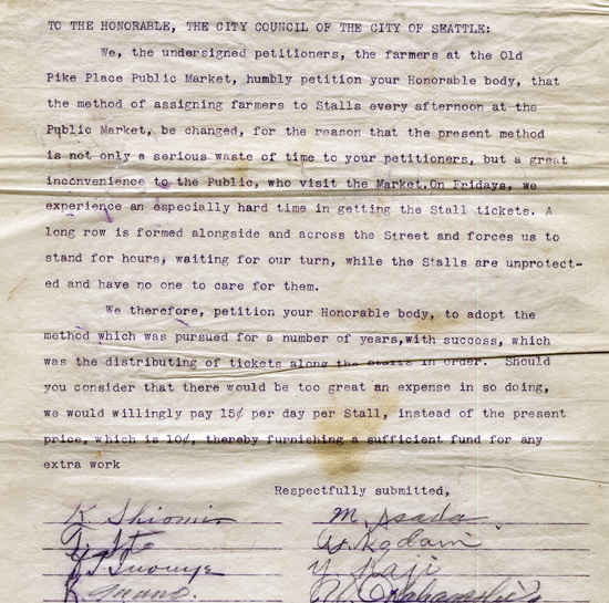 Petition of farmers in regard to method of assigning space at Pike Place Public Market, 1913