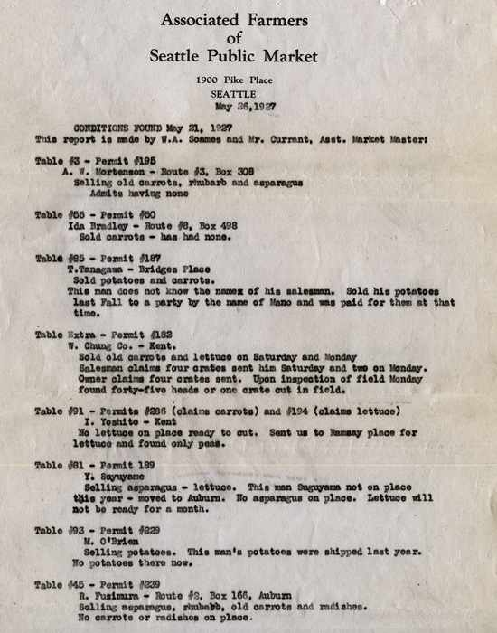 Given the competition for space, there were always complaints about favoritism by the Market Master or cheating by other farmers. In the 1910s, two farmers' associations sprang up: the Washington Farmers Association representing Japanese farmers, and White Home Growers Association representing the rest, including European immigrant farmers. Although these associations sometimes cooperated on areas of common interest, tensions emerged.
