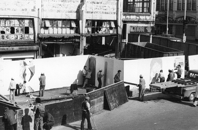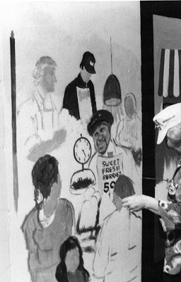Artist at work during Corner Market paint-in, 1975