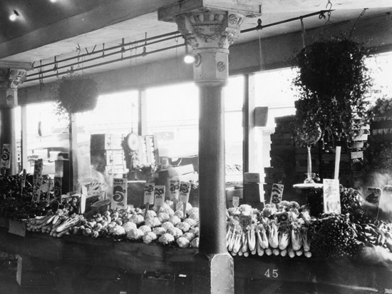 Farmer's stall in main market, Pike Place level, 1922