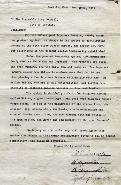The City Council introduced a resolution in 1910 forbidding non-citizen farmers at the market, but opposition from the Chamber of Commerce and a threatened legal challenge from the Japanese consulate prevented its passage. Instead, the lottery assigning stalls was changed so that odd-numbered stalls were assigned to Japanese farmers and even-numbered stalls assigned to everyone else. This pushed many Japanese to the least desirable area in the back of the market.