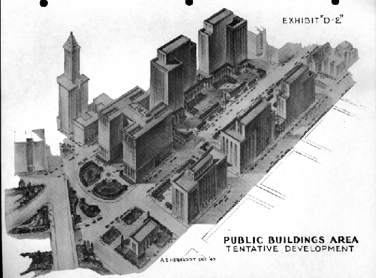 The Planning Commission submitted a "Report on Proposed Public Buildings Area" in 1945 which incorporated Bartholomew's work. The report defined the "Public Buildings Area" as "a space set aside in the city's planning program for the location of government offices." The Public Buildings Area was specifically not intended to be a Civic Center, such as San Francisco had, which incorporated cultural institutions. The report identified the two blocks between Third and Fourth Avenues from James Street to Columbia as "the best sites for any public buildings" because of the proximity both to businesses and other governmental offices.