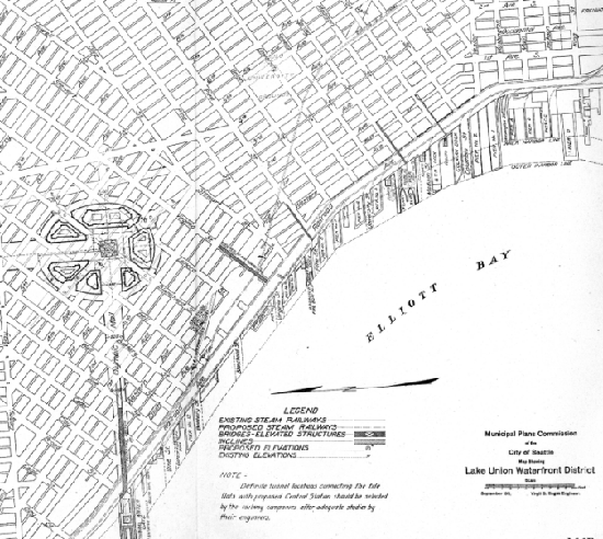 The Civic Center was only a small part of Bogue's plan. His two-volume report included an elaborate and well thought out transportation system, including rapid transit; a plan for the Seattle coastline; and a proposal for an expansion of the parks and boulevards, including a recommendation to set aside Mercer Island as an "island park - a people's playground, worthy of the city of millions which will someday surround Lake Washington."