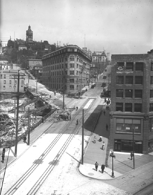 One of the most controversial parts of Bogue's plan for the citizens of Seattle was the location. The plan grouped all public buildings in a Civic Center in the Denny Hill regrade district, with the center at Fourth and Blanchard. Many citizens felt the location was too far from the City center.