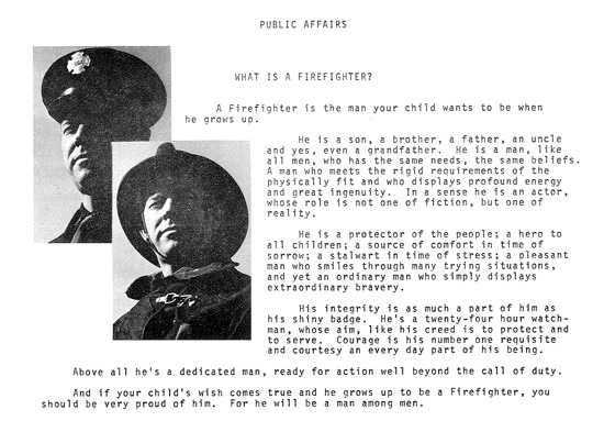 Public Relations was known as Public Affairs by 1969 but continued to build on the characteristics of dedication and protection of the people, and by 1969 described the firefighter as "a man among men." The 1960s saw continued growth in training as well as fire prevention work. In 1962 prevention was described as male work: "Complete and fair enforcement of the Fire Code and applicable sections of the Building Code through a program of continuing year around fire inspection of all effected [sic] buildings and occupancies are as fundamental to our fire prevention effort as are blocking and tackling to a football team."
