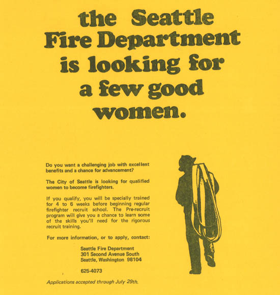 Mayor Wes Uhlman and Fire Chief Jack Richards exchanged correspondence in 1974 about bringing women firefighters into the Department. The City considered the possibility of using San Diego as a model; Chief Bell wrote from San Diego that its program was not successful as the first five females were terminated for "lack of required strength." Bell also warned Richards that in addition to the strength and agility issues, "You may also expect considerable reaction from your employees, their wives, and the public which quite probably will put you in a position of extreme criticism and condemnation regardless of what action you take....If you change any existing standards you will be charged with discrimination in favor of females, if you don't you will be discriminating against females."
