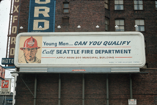 Although minority men were a focus of recruiting in the 1960s, women were not. The first woman to work in the Seattle Fire Department in any capacity was Marcella Delfel Hook, employed from 1942 to 1943 as a stenographer and clerical worker in the Chief's Office. A Seattle Firefighters Ladies' Auxiliary was formed in October 1966 to provide aid to families and assist at social events.