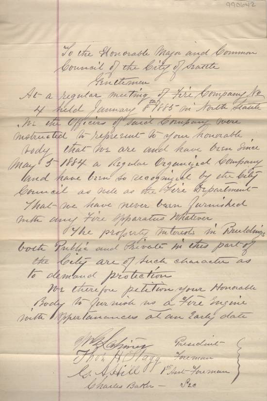 The City of Seattle was incorporated in 1869 but with no established means to protect the City from "accidents by fire." Provisions in earlier charters were made for regulating markets, burying the dead, and preventing animals from running at large, but fire protection was not added until 1883. That year, the Charter created a fire department and provided for "fire engines and other apparatus, and a sufficient supply of water, and to levy and collect special taxes for these purposes...." Equipment purchases were funded, but not firefighters.