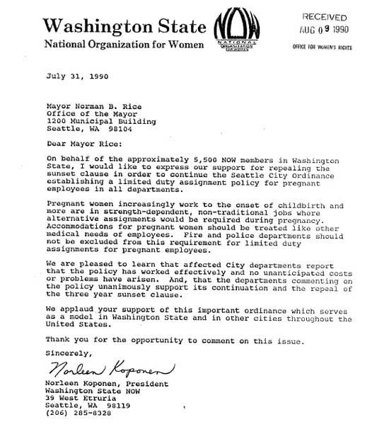 The ordinance guaranteeing light duty for pregnant City employees in non-traditional jobs was passed with a sunset clause which did not allow the ordinance to become final until it was established that no unanticipated costs or problems arose and that the policy worked smoothly. After three years, in 1990, the sunset clause on the ordinance was removed.