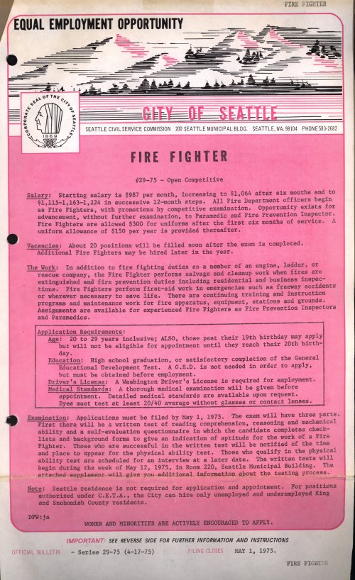 To become a firefighter in 1975, applicants had to pass a written exam, oral interview, physical abilities test and Law Enforcement Officer and Firefighters (LEOFF) medical standards test. Successful completion of a ten-week recruit school was required as well as a six-month probationary employment period.