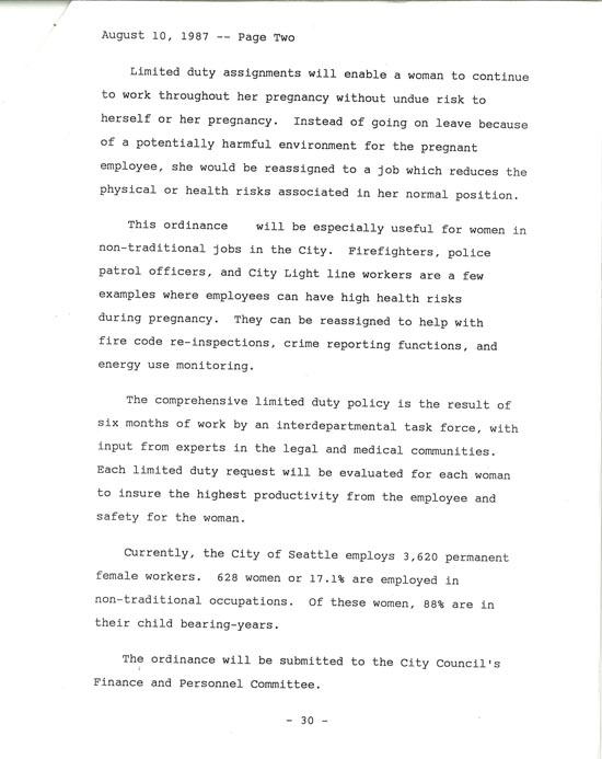 The case was won and King County Superior Court Judge Heavey ruled in 1988 that the Relief Association illegally discriminated against pregnant firefighters by denying them disability payments. Oliver and Solberg's lawsuit resulted in a limited duty assignment policy for pregnant City employees. Everyone in the Department benefited however, when light duty subsequently became a possibility for all members of the Fire Department with temporary disabilities. This policy primarily affected women in strength-dependent, non-traditional positions - not just firefighters, but City Light and Police employees as well. At the time the ordinance was passed, 628 women or 17% of all female employees for the City were employed in non-traditional occupations.