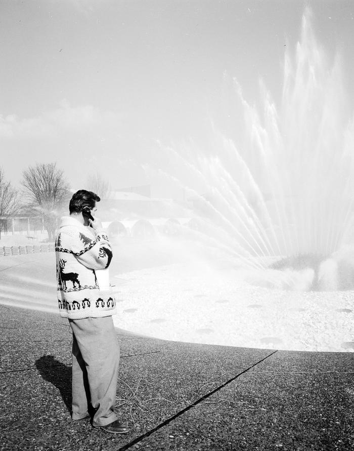 Water Department employee with handheld communication device adjusting the fountain's nozzles, March 12, 1962