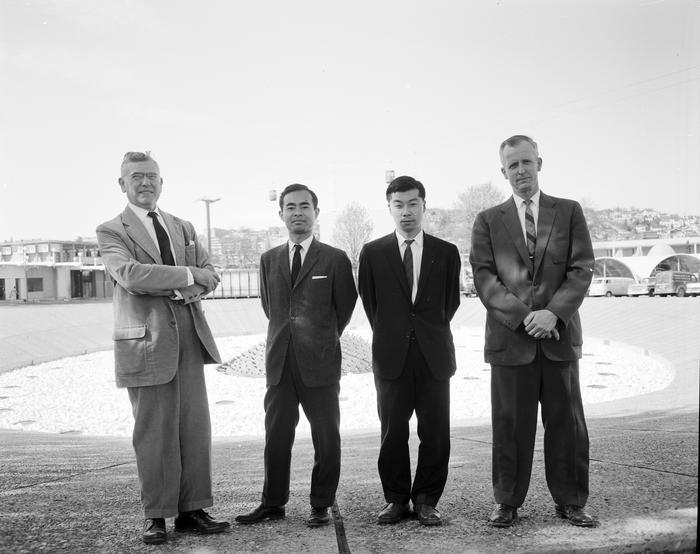 Paul Thiry and architects Shimizu, Matsushita, and John Phillips in front of fountain, April 12, 1962