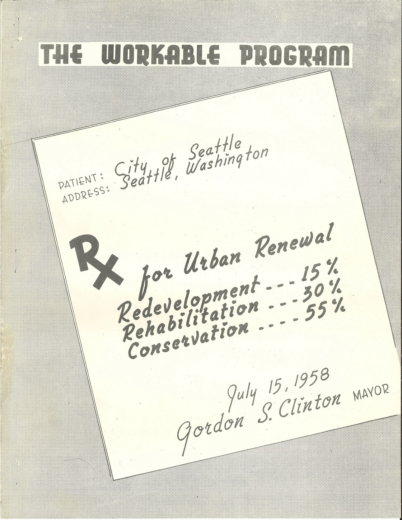 In July 1958, Wegg submitted the city's first workable program for approval by the Mayor and City Council. In it, he claimed "there are clearly evident symptoms of blight, the municipal cancer which afflicts every city to a greater or lesser degree. Urban renewal, the proven remedy, is indicated." The plan described existing relevant city codes, such as building, fire prevention, electrical, and plumbing codes, and argued that those codes, coupled with the city's new comprehensive plan, Planning Commission work, Council and community support, and already existing neighborhood and land use studies gave Seattle a strong foundation for effectively carrying out the work of urban renewal.