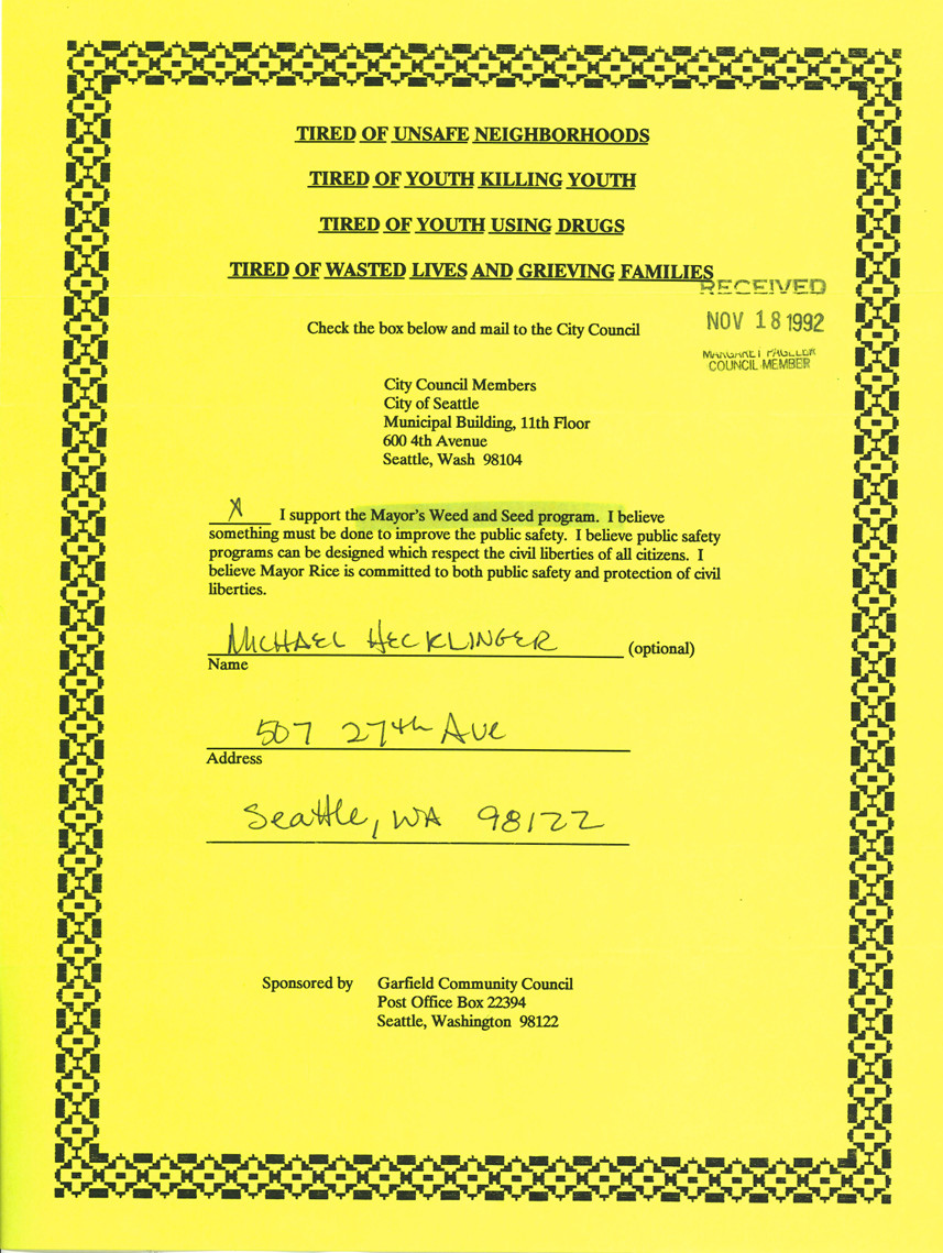 Councilmember Margaret Pageler introduced the Weed and Seed legislation and played a leading role in promoting its acceptance in the community and securing its passage by the City Council. In the Central District, the Garfield Community Council and Central Area Neighbors Against Drugs formed the broadest networks of support to promote the legislation and sent dozens of representatives to speak at council meetings. Members of the Garfield Community Council promoted the campaign for Weed and Seed through a pamphlet petition beginning in November of 1992, urging Central District residents to declare themselves "tired of unsafe neighborhoods, tired of youth killing youth, tired of youth using drugs, tired of wasted lives and grieving families" and in support of increased policing.