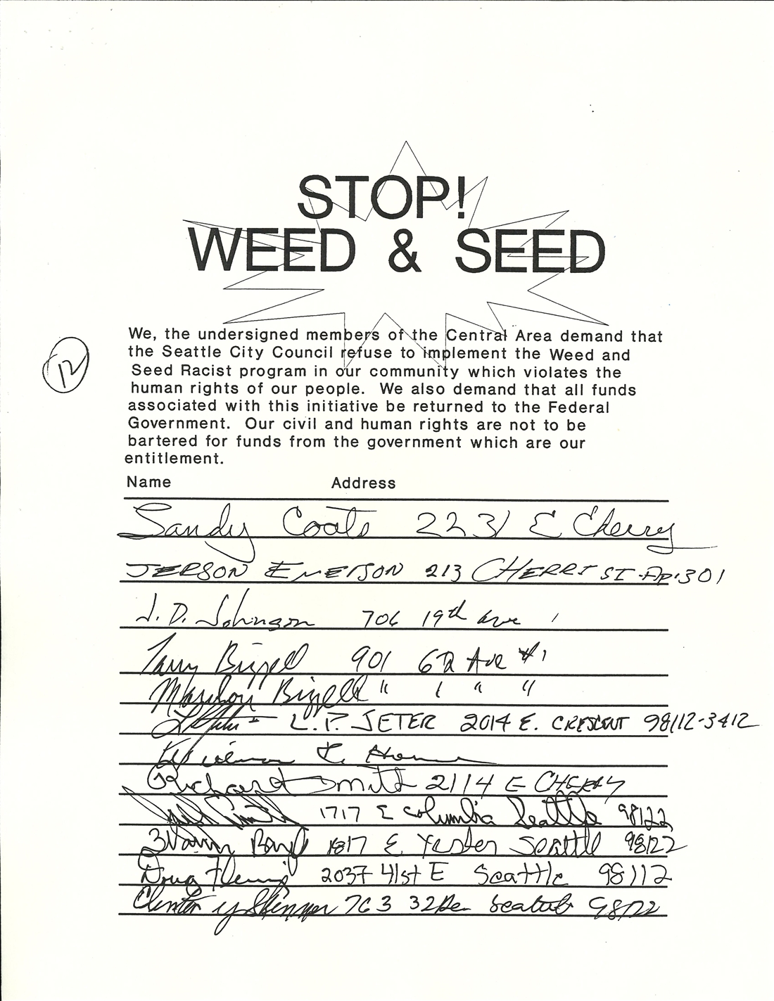 In 1991, the George H.W. Bush administration rolled out the controversial "Weed and Seed" program, expanding punitive drug policies and militarized law enforcement across the United States. This program offered cities across the country generous grant funding for urban policing initiatives which sought to "weed" out violence, drug dealing, and crime, and "seed" under-resourced areas with programming and economic opportunity. While this program was marketed as a community revitalization and reinvestment initiative, national funding splits in most cities allocated over 80% of grant dollars directly to policing efforts. In 1992, Seattle was one of the first major cities to apply for law enforcement funding through the Department of Justice (DOJ) fund, an allocation of over $1 million which applied specifically to the Central District.