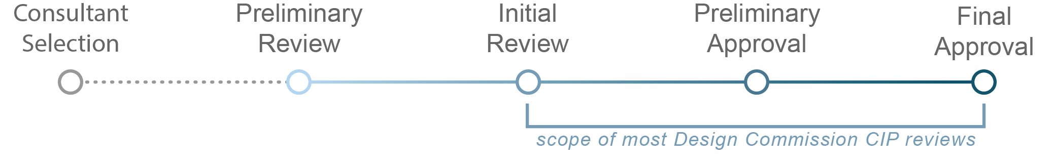 Consultant selection for a CIP project can be crucial to its success. City departments developing a Request for Qualifications (RFQ) or Request for Proposal (RFP) for projects subject to our review should involve at least one Commissioner at these initial stages of project development and design.